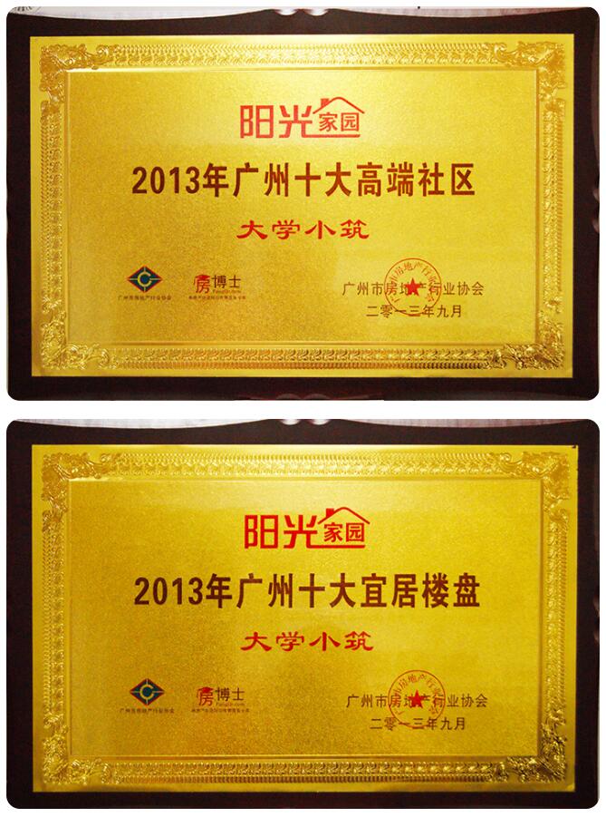 2013年9月13日,大学小筑再获殊荣,受专家评审团的一致认可及好评,获得由广州房地产行业协会主办的第三届“阳光家园”杯“广州十大宜居楼盘”、“广州十大高端社区” 奖。